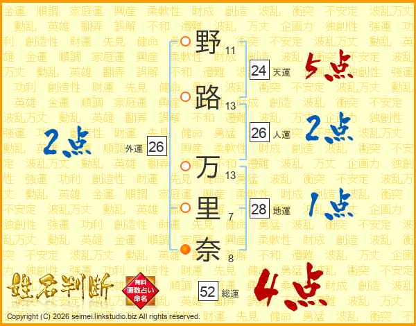 野路万里奈さんの総運は52画の4点!