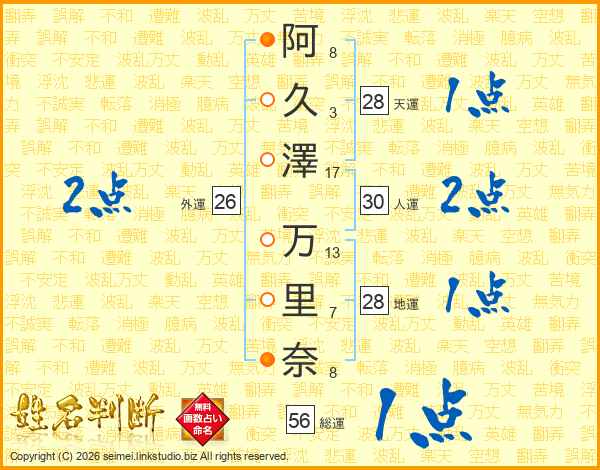 阿(8画)久(3画)澤(17画) 万(13画)里(7画)奈(8画)
