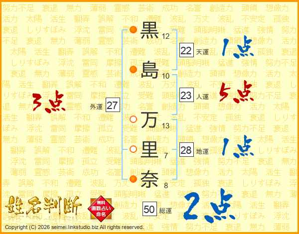 黒(12画)島(10画) 万(13画)里(7画)奈(8画)