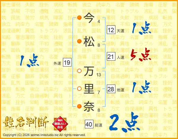 今(4画)松(8画) 万(13画)里(7画)奈(8画)