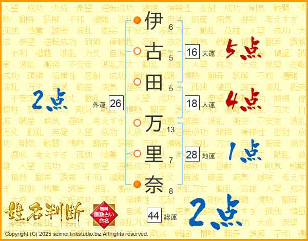 伊(6画)古(5画)田(5画) 万(13画)里(7画)奈(8画)