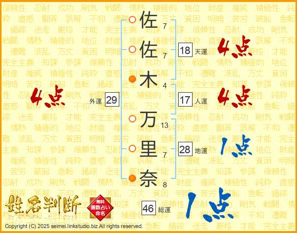 佐(7画)佐(7画)木(4画) 万(13画)里(7画)奈(8画)