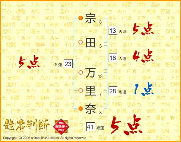 宗(8画)田(5画) 万(13画)里(7画)奈(8画)