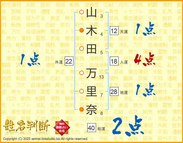 山(3画)木(4画)田(5画) 万(13画)里(7画)奈(8画)