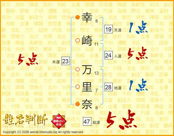 幸(8画)崎(11画) 万(13画)里(7画)奈(8画)