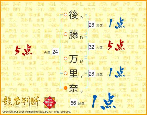 後(9画)藤(19画) 万(13画)里(7画)奈(8画)