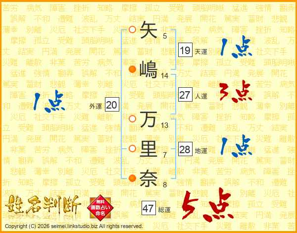矢(5画)嶋(14画) 万(13画)里(7画)奈(8画)