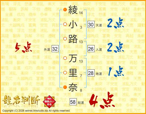 綾(14画)小(3画)路(13画) 万(13画)里(7画)奈(8画)