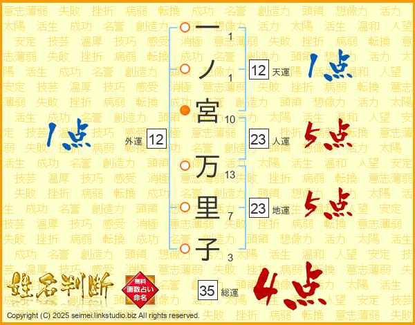 一(1画)ノ(1画)宮(10画) 万(13画)里(7画)子(3画)