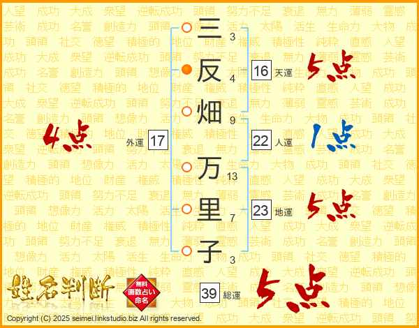 三(3画)反(4画)畑(9画) 万(13画)里(7画)子(3画)