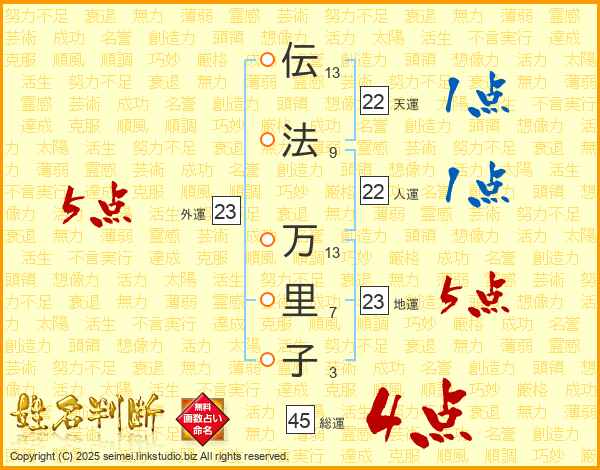 伝(13画)法(9画) 万(13画)里(7画)子(3画)