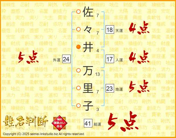 佐(7画)々(7画)井(4画) 万(13画)里(7画)子(3画)
