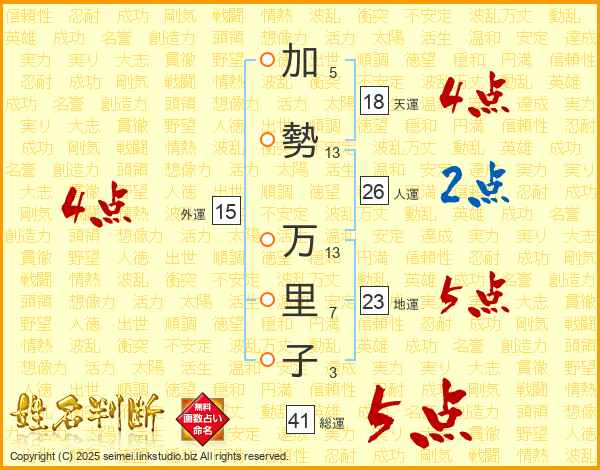 加(5画)勢(13画) 万(13画)里(7画)子(3画)