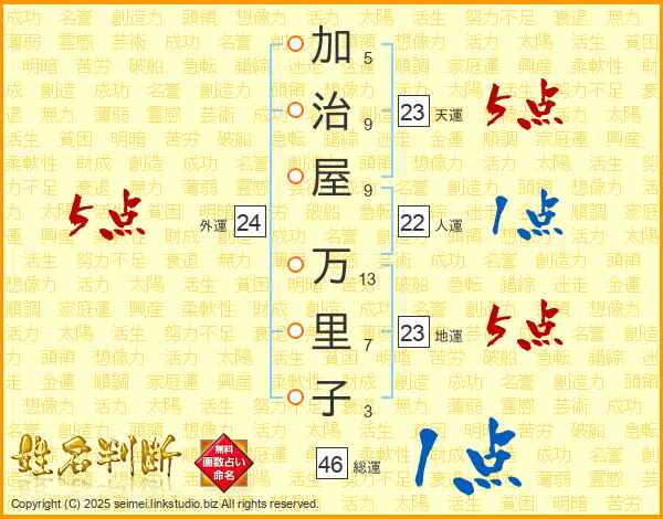 加(5画)治(9画)屋(9画) 万(13画)里(7画)子(3画)