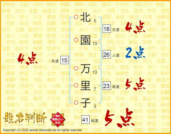 北(5画)園(13画) 万(13画)里(7画)子(3画)