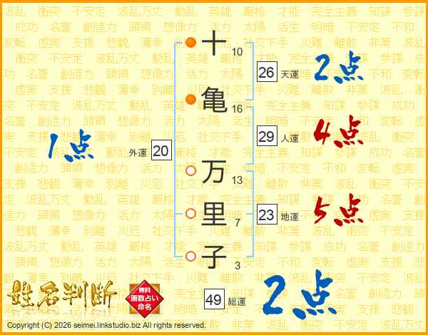 十(10画)亀(16画) 万(13画)里(7画)子(3画)