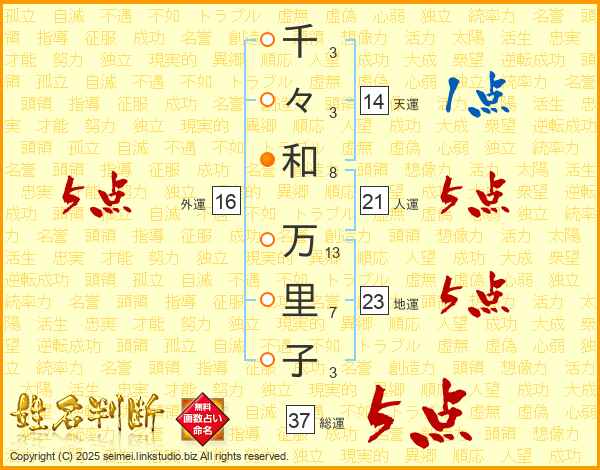 千(3画)々(3画)和(8画) 万(13画)里(7画)子(3画)