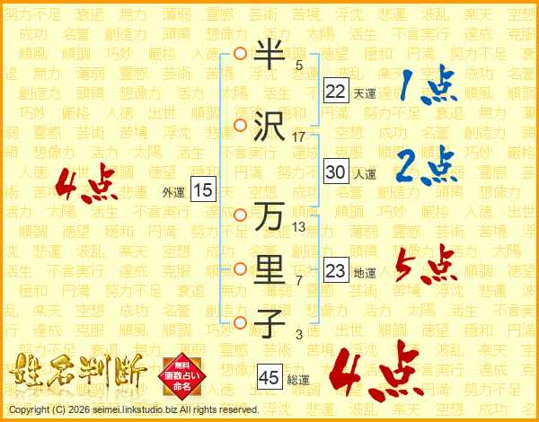 半(5画)沢(17画) 万(13画)里(7画)子(3画)