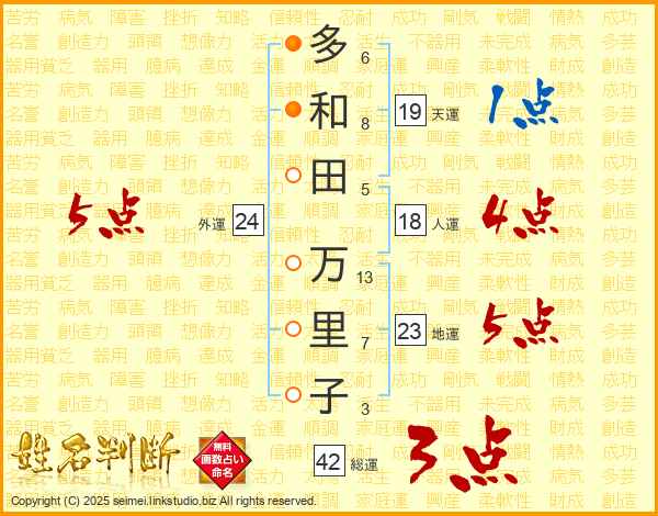 多(6画)和(8画)田(5画) 万(13画)里(7画)子(3画)