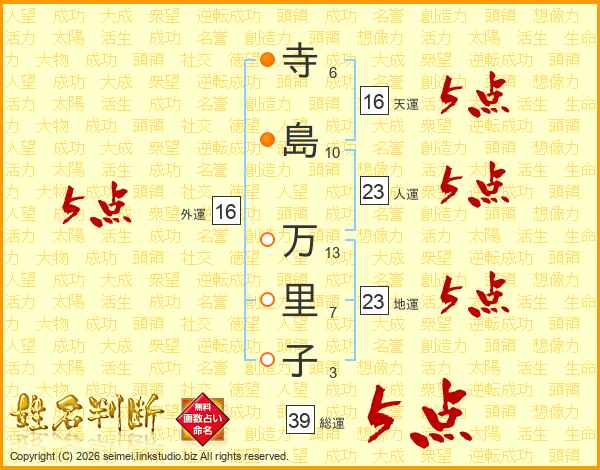 寺(6画)島(10画) 万(13画)里(7画)子(3画)