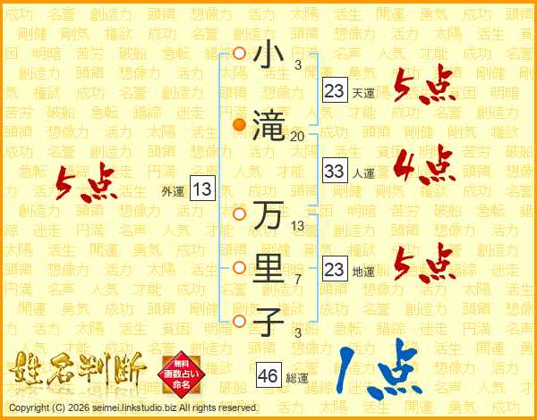 小(3画)滝(20画) 万(13画)里(7画)子(3画)