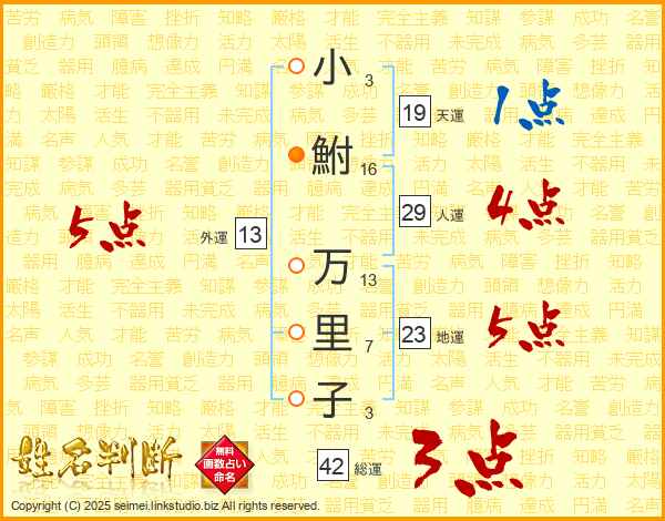 小(3画)鮒(16画) 万(13画)里(7画)子(3画)