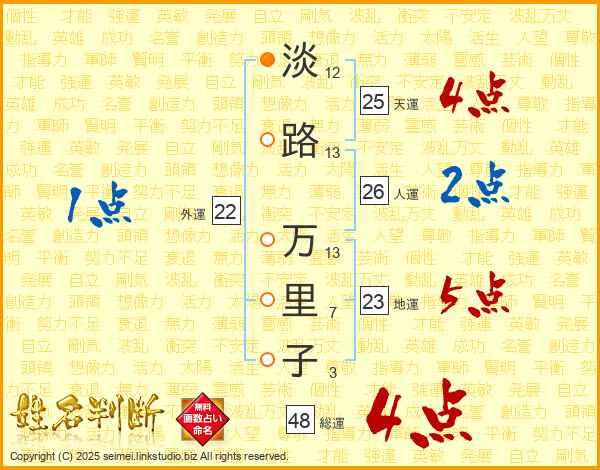 淡(12画)路(13画) 万(13画)里(7画)子(3画)