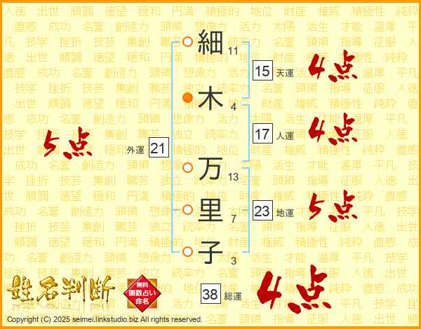 細(11画)木(4画) 万(13画)里(7画)子(3画)