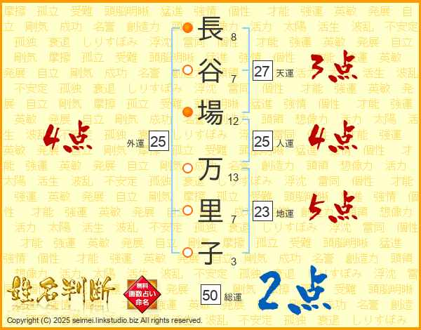 長(8画)谷(7画)場(12画) 万(13画)里(7画)子(3画)