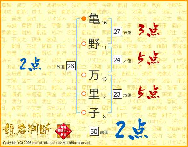 亀(16画)野(11画) 万(13画)里(7画)子(3画)