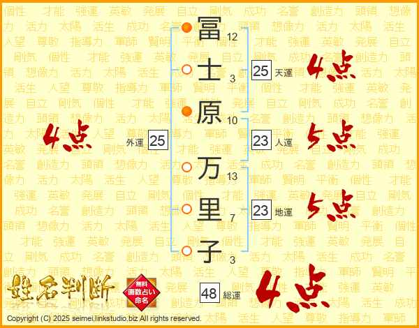 冨(12画)士(3画)原(10画) 万(13画)里(7画)子(3画)