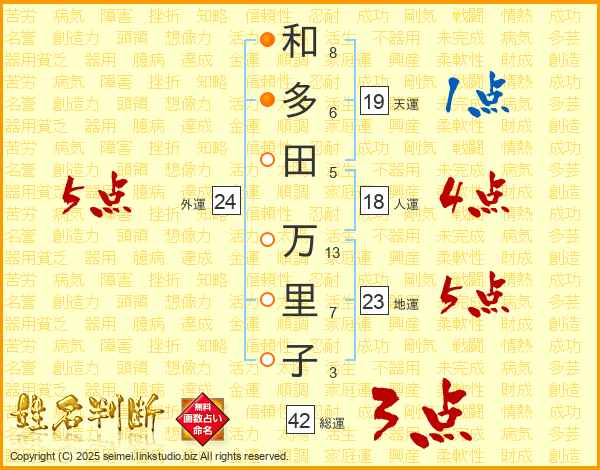 和(8画)多(6画)田(5画) 万(13画)里(7画)子(3画)