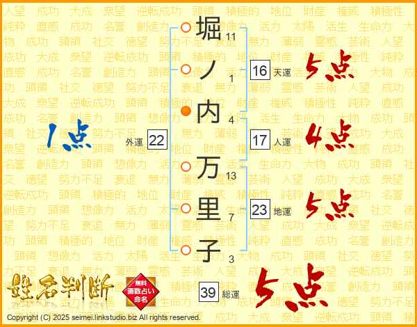堀ノ内万里子さんの総運は39画の5点!