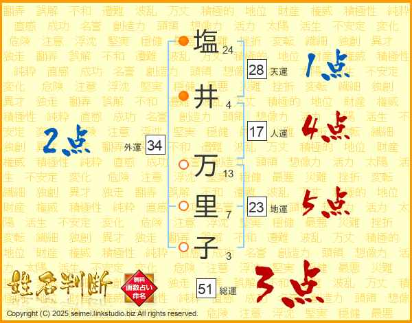 塩(24画)井(4画) 万(13画)里(7画)子(3画)