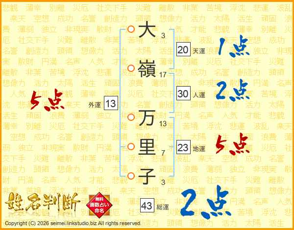 大(3画)嶺(17画) 万(13画)里(7画)子(3画)