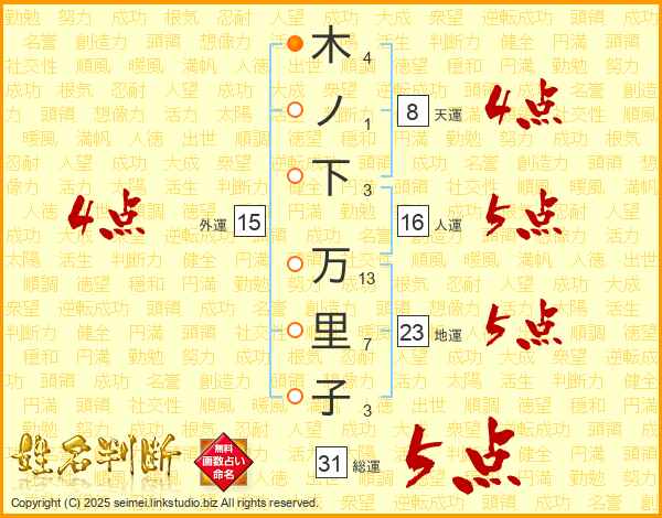 木(4画)ノ(1画)下(3画) 万(13画)里(7画)子(3画)