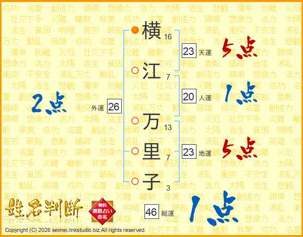 横(16画)江(7画) 万(13画)里(7画)子(3画)
