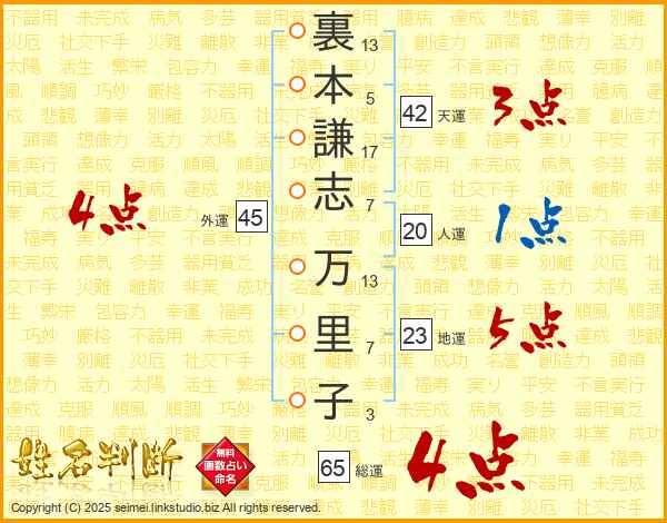 裏本謙志万里子さんの総運は65画の4点!
