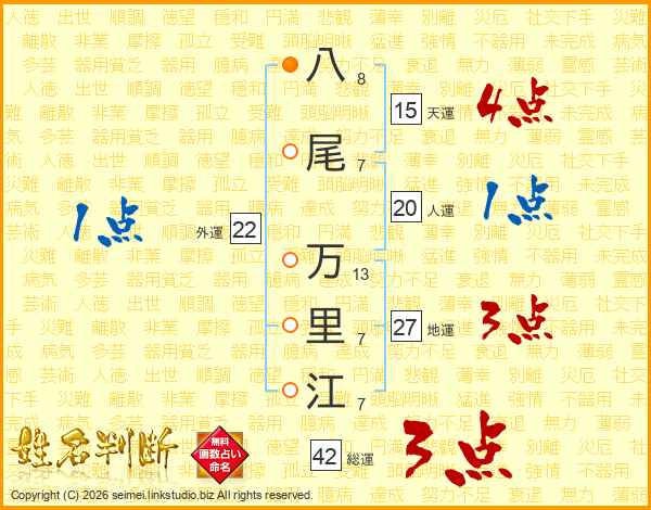 八(8画)尾(7画) 万(13画)里(7画)江(7画)