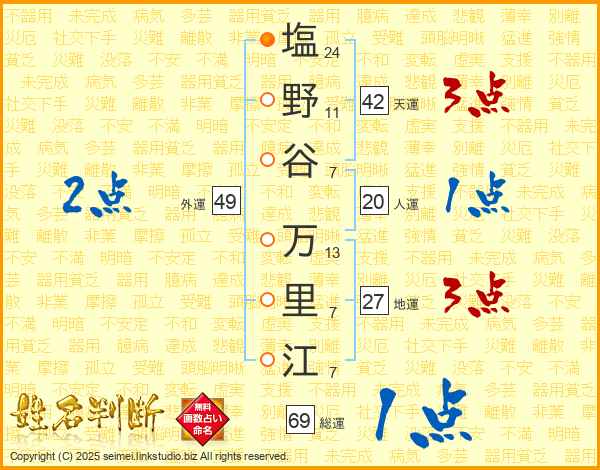 塩(24画)野(11画)谷(7画) 万(13画)里(7画)江(7画)