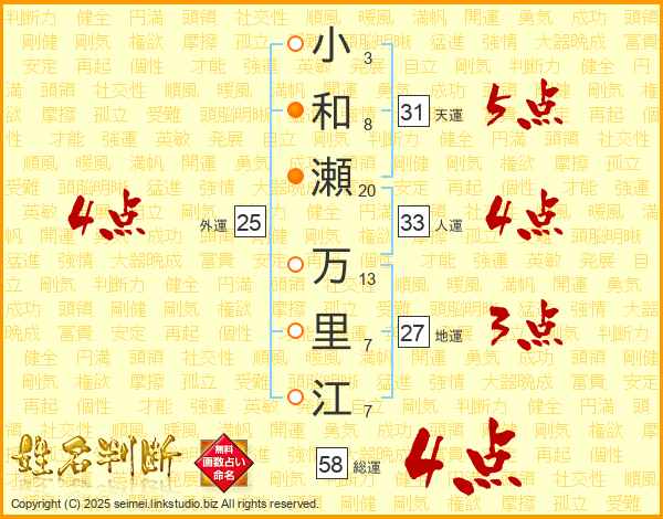 小(3画)和(8画)瀬(20画) 万(13画)里(7画)江(7画)