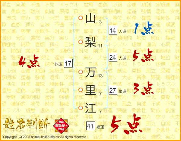 山(3画)梨(11画) 万(13画)里(7画)江(7画)