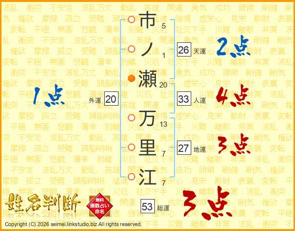 市(5画)ノ(1画)瀬(20画) 万(13画)里(7画)江(7画)