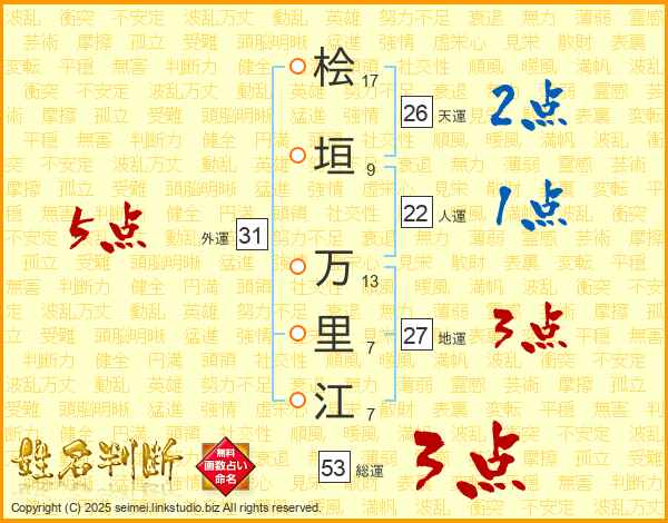 桧(17画)垣(9画) 万(13画)里(7画)江(7画)