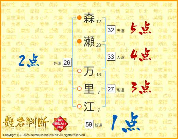 森(12画)瀬(20画) 万(13画)里(7画)江(7画)