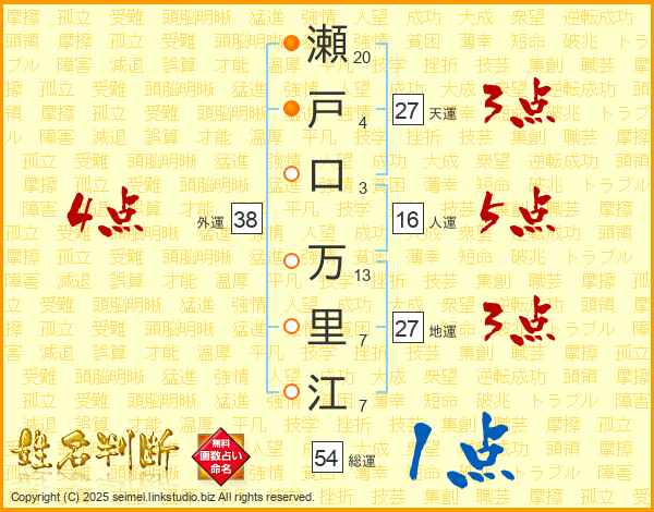 瀬(20画)戸(4画)口(3画) 万(13画)里(7画)江(7画)