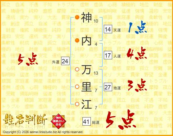 神(10画)内(4画) 万(13画)里(7画)江(7画)