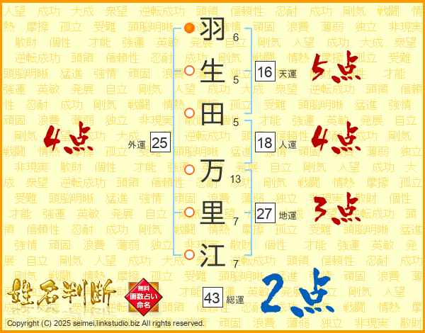 羽(6画)生(5画)田(5画) 万(13画)里(7画)江(7画)