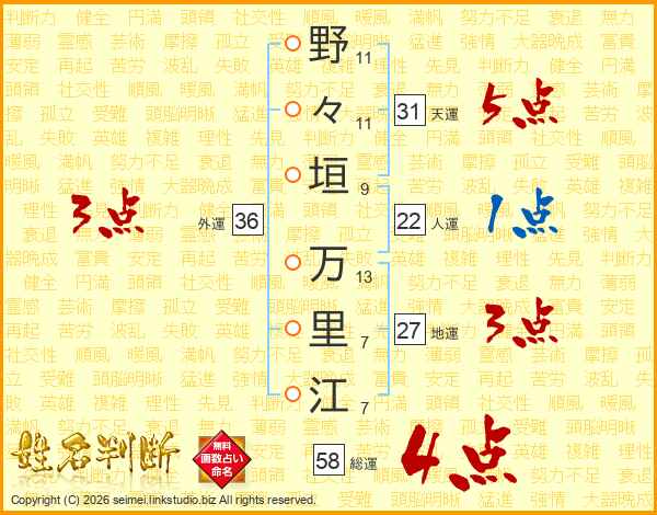 野々垣万里江さんの総運は58画の4点!