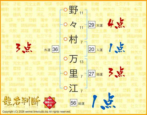 野々村万里江さんの総運は56画の1点!